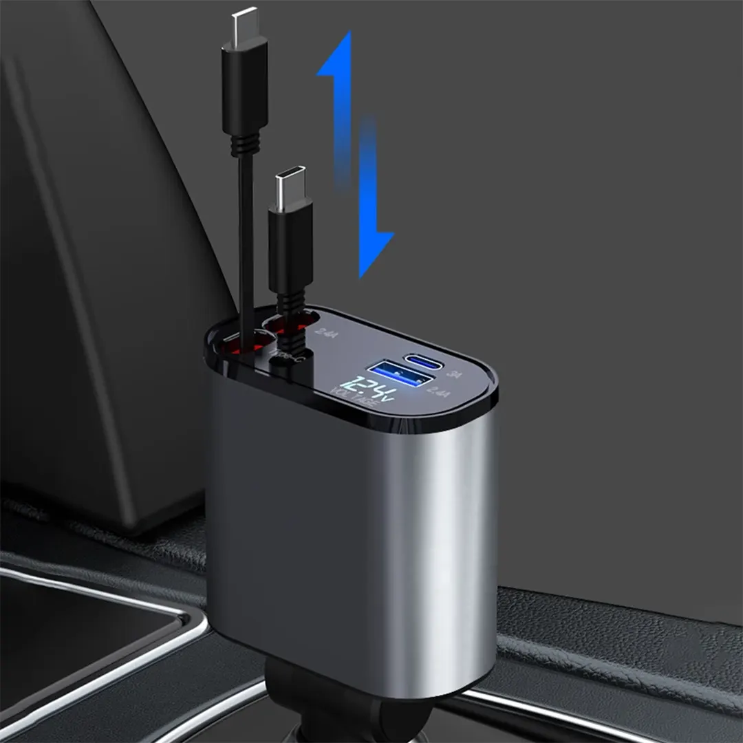 شاحن سيارة القابل للسحب بكابلين للشحن لايتنينغ وتايب سي مع منفذين يو إس بي وتايب سي 120 واط