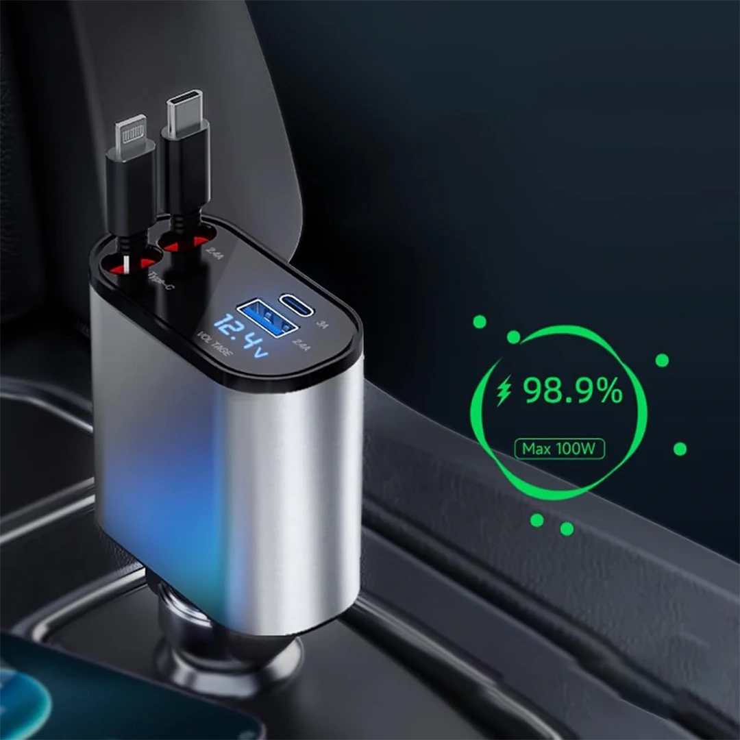 شاحن السيارة القابل للسحب يأتي بكابلين للشحن، لايتنينغ وتايب سي، مع منفذين USB وType-C بقدرة 120 واط، ليضمن لك شحن سريع وفعال لجميع أجهزتك أثناء التنقل.