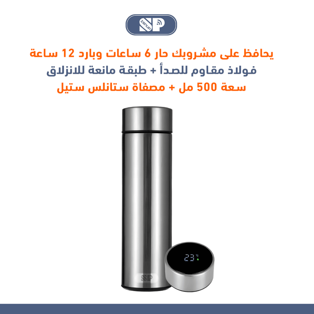 حافظة ماء ذكية مزودة بمؤشر حرارة لعرض درجة حرارة المشروب داخل الحافظة، مناسبة لحفظ المشروبات الساخنة والباردة أثناء التنقل أو الاستخدام اليومي.